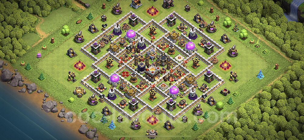 This Town Hall 11 hybrid base offers the best of both worlds - strong resource protection combined with effective trophy defense. The versatile design makes it an excellent choice for players who want to protect their loot while maintaining their trophy count. This balanced approach ensures you don't sacrifice one aspect of defense for another, making it ideal for active players across all league levels. The hybrid layout features centralized resource storages alongside a well-protected Town Hall, with multiple defensive layers that deter both farming raids and trophy pushers. High-value targets are strategically positioned within overlapping defense ranges, forcing attackers to make difficult choices about which objectives to prioritize. The compartmentalized design prevents attackers from easily achieving both loot destruction and the Town Hall kill in a single attack. Defense placement in this hybrid base creates strong coverage against both ground and air attacks. Inferno Towers, X-Bows, and Eagle Artillery work in concert to eliminate threats quickly, while splash damage defenses like Wizard Towers and Bomb Towers counter swarm strategies. The base's funnel-resistant design and strategic trap placement make it effective against popular attack strategies including QC LaLoon (Queen Charge Lava Hound Balloon), Blizzard attacks, and Yeti Smash compositions.