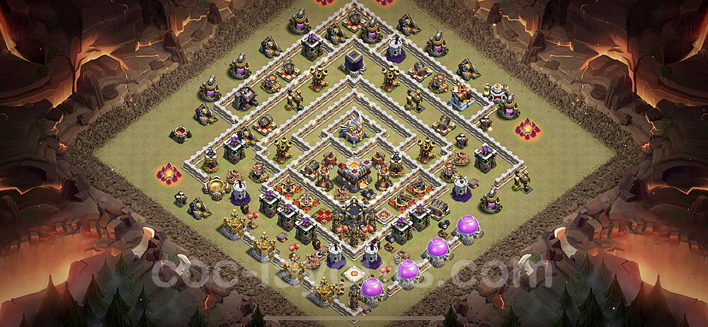 This Town Hall 11 war base is specifically designed to defend against 2-star and 3-star attacks in Clan Wars and Clan War Leagues. The strategic placement of defenses creates multiple compartments that force attackers to use more troops and spells than anticipated. Key defensive structures like Eagle Artillery, Inferno Towers, and X-Bows are positioned to cover crucial sections of the base, making it extremely difficult for opponents to secure a perfect attack. The core of this war base features a centralized Town Hall and Clan Castle, protected by multiple layers of walls and high-damage defenses. This layout forces attackers to commit significant resources just to reach the center, often leaving them without enough firepower to secure the Town Hall destruction. The anti-2-star design ensures that even if attackers breach the outer defenses, they'll struggle to achieve a 50% destruction rating. Air defenses are strategically spread to counter popular air attack strategies like LaLoon (Lava Hound + Balloons) and Electrone (Electro Dragons + Stone Slammer). The symmetrical trap placement and strategic Hidden Tesla positions create deadly surprise elements that can completely derail an attacker's plan. This base has been tested against various meta attack strategies and has consistently proven effective in preventing 3-star attacks.