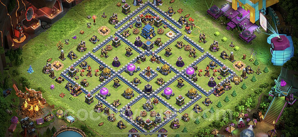 This Town Hall 12 hybrid base offers the best of both worlds - strong resource protection combined with effective trophy defense. The versatile design makes it an excellent choice for players who want to protect their loot while maintaining their trophy count. This balanced approach ensures you don't sacrifice one aspect of defense for another, making it ideal for active players across all league levels. The hybrid layout features centralized resource storages alongside a well-protected Town Hall, with multiple defensive layers that deter both farming raids and trophy pushers. High-value targets are strategically positioned within overlapping defense ranges, forcing attackers to make difficult choices about which objectives to prioritize. The compartmentalized design prevents attackers from easily achieving both loot destruction and the Town Hall kill in a single attack. Defense placement in this hybrid base creates strong coverage against both ground and air attacks. Inferno Towers, X-Bows, and Eagle Artillery work in concert to eliminate threats quickly, while splash damage defenses like Wizard Towers and Bomb Towers counter swarm strategies. The base's funnel-resistant design and strategic trap placement make it effective against popular attack strategies including QC LaLoon (Queen Charge Lava Hound Balloon), Blizzard attacks, and Yeti Smash compositions.