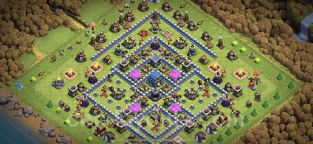 This Town Hall 12 hybrid base offers the best of both worlds - strong resource protection combined with effective trophy defense. The versatile design makes it an excellent choice for players who want to protect their loot while maintaining their trophy count. This balanced approach ensures you don't sacrifice one aspect of defense for another, making it ideal for active players across all league levels. The hybrid layout features centralized resource storages alongside a well-protected Town Hall, with multiple defensive layers that deter both farming raids and trophy pushers. High-value targets are strategically positioned within overlapping defense ranges, forcing attackers to make difficult choices about which objectives to prioritize. The compartmentalized design prevents attackers from easily achieving both loot destruction and the Town Hall kill in a single attack. Defense placement in this hybrid base creates strong coverage against both ground and air attacks. Inferno Towers, X-Bows, and Eagle Artillery work in concert to eliminate threats quickly, while splash damage defenses like Wizard Towers and Bomb Towers counter swarm strategies. The base's funnel-resistant design and strategic trap placement make it effective against popular attack strategies including QC LaLoon (Queen Charge Lava Hound Balloon), Blizzard attacks, and Yeti Smash compositions.