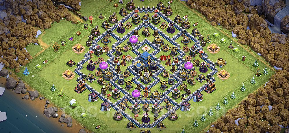 This Town Hall 12 hybrid base offers the best of both worlds - strong resource protection combined with effective trophy defense. The versatile design makes it an excellent choice for players who want to protect their loot while maintaining their trophy count. This balanced approach ensures you don't sacrifice one aspect of defense for another, making it ideal for active players across all league levels. The hybrid layout features centralized resource storages alongside a well-protected Town Hall, with multiple defensive layers that deter both farming raids and trophy pushers. High-value targets are strategically positioned within overlapping defense ranges, forcing attackers to make difficult choices about which objectives to prioritize. The compartmentalized design prevents attackers from easily achieving both loot destruction and the Town Hall kill in a single attack. Defense placement in this hybrid base creates strong coverage against both ground and air attacks. Inferno Towers, X-Bows, and Eagle Artillery work in concert to eliminate threats quickly, while splash damage defenses like Wizard Towers and Bomb Towers counter swarm strategies. The base's funnel-resistant design and strategic trap placement make it effective against popular attack strategies including QC LaLoon (Queen Charge Lava Hound Balloon), Blizzard attacks, and Yeti Smash compositions.
