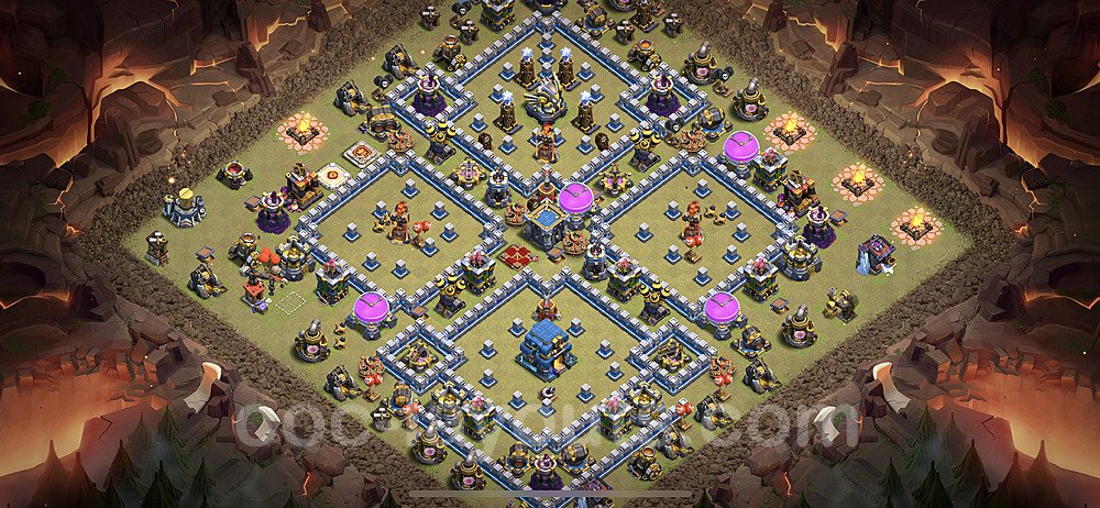 This Town Hall 12 war base is specifically designed to defend against 2-star and 3-star attacks in Clan Wars and Clan War Leagues. The strategic placement of defenses creates multiple compartments that force attackers to use more troops and spells than anticipated. Key defensive structures like Eagle Artillery, Inferno Towers, and X-Bows are positioned to cover crucial sections of the base, making it extremely difficult for opponents to secure a perfect attack. The core of this war base features a centralized Town Hall and Clan Castle, protected by multiple layers of walls and high-damage defenses. This layout forces attackers to commit significant resources just to reach the center, often leaving them without enough firepower to secure the Town Hall destruction. The anti-2-star design ensures that even if attackers breach the outer defenses, they'll struggle to achieve a 50% destruction rating. Air defenses are strategically spread to counter popular air attack strategies like LaLoon (Lava Hound + Balloons) and Electrone (Electro Dragons + Stone Slammer). The symmetrical trap placement and strategic Hidden Tesla positions create deadly surprise elements that can completely derail an attacker's plan. This base has been tested against various meta attack strategies and has consistently proven effective in preventing 3-star attacks.