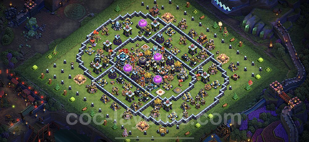 This Town Hall 13 farming base is optimized to protect your resources including Gold, Elixir, and Dark Elixir from raiders. The layout features centralized storages with multiple compartments that make it extremely difficult for attackers to steal large amounts of resources in a single raid. This design philosophy prioritizes resource protection over trophies, making it ideal for players focused on upgrading their village. The strategic placement of resource storages ensures they are well-protected by high-damage defenses like X-Bows, Inferno Towers, and Eagle Artillery. Each storage is surrounded by multiple wall layers and defensive structures, forcing attackers to invest heavily in troops and spells to reach your loot. The farming base design also incorporates strategic dead zones where attackers' troops tend to path inefficiently, wasting time and taking heavy damage from nearby defenses. Collectors and mines are positioned on the outer edges as "bait" while your main storages remain heavily protected in the core. This layout has proven effective against common farming strategies like BARCH (Barbarians + Archers), GoWiPe (Golems + Wizards + Pekka), and mass Miner attacks. The compartmentalized design prevents attackers from funneling straight to your resources, ensuring you maintain your hard-earned loot for important upgrades.