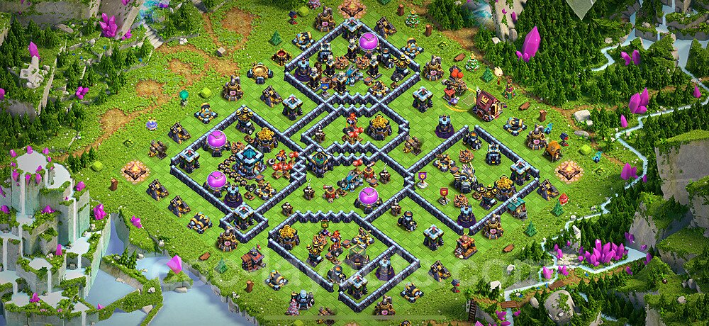 This Town Hall 13 hybrid base offers the best of both worlds - strong resource protection combined with effective trophy defense. The versatile design makes it an excellent choice for players who want to protect their loot while maintaining their trophy count. This balanced approach ensures you don't sacrifice one aspect of defense for another, making it ideal for active players across all league levels. The hybrid layout features centralized resource storages alongside a well-protected Town Hall, with multiple defensive layers that deter both farming raids and trophy pushers. High-value targets are strategically positioned within overlapping defense ranges, forcing attackers to make difficult choices about which objectives to prioritize. The compartmentalized design prevents attackers from easily achieving both loot destruction and the Town Hall kill in a single attack. Defense placement in this hybrid base creates strong coverage against both ground and air attacks. Inferno Towers, X-Bows, and Eagle Artillery work in concert to eliminate threats quickly, while splash damage defenses like Wizard Towers and Bomb Towers counter swarm strategies. The base's funnel-resistant design and strategic trap placement make it effective against popular attack strategies including QC LaLoon (Queen Charge Lava Hound Balloon), Blizzard attacks, and Yeti Smash compositions.