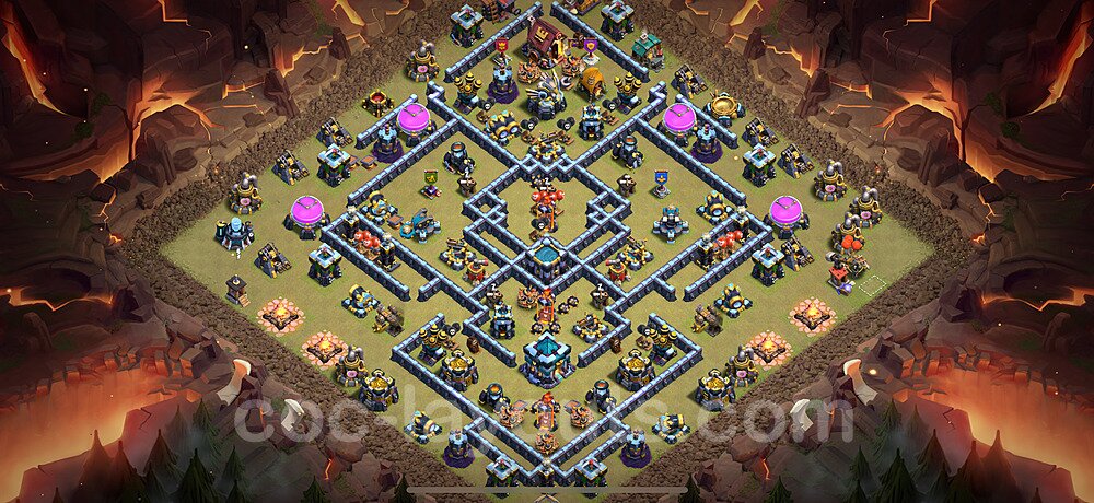 This Town Hall 13 war base is specifically designed to defend against 2-star and 3-star attacks in Clan Wars and Clan War Leagues. The strategic placement of defenses creates multiple compartments that force attackers to use more troops and spells than anticipated. Key defensive structures like Eagle Artillery, Inferno Towers, and X-Bows are positioned to cover crucial sections of the base, making it extremely difficult for opponents to secure a perfect attack. The core of this war base features a centralized Town Hall and Clan Castle, protected by multiple layers of walls and high-damage defenses. This layout forces attackers to commit significant resources just to reach the center, often leaving them without enough firepower to secure the Town Hall destruction. The anti-2-star design ensures that even if attackers breach the outer defenses, they'll struggle to achieve a 50% destruction rating. Air defenses are strategically spread to counter popular air attack strategies like LaLoon (Lava Hound + Balloons) and Electrone (Electro Dragons + Stone Slammer). The symmetrical trap placement and strategic Hidden Tesla positions create deadly surprise elements that can completely derail an attacker's plan. This base has been tested against various meta attack strategies and has consistently proven effective in preventing 3-star attacks.