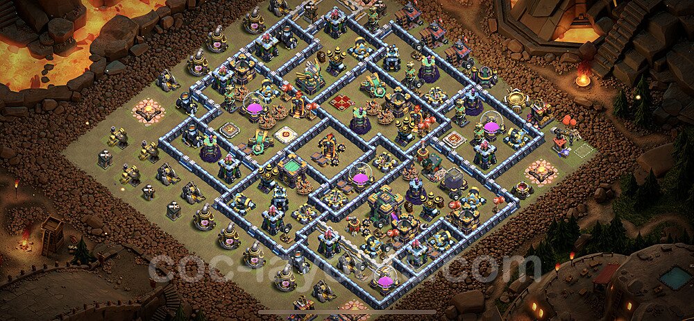 This Town Hall 14 hybrid base offers the best of both worlds - strong resource protection combined with effective trophy defense. The versatile design makes it an excellent choice for players who want to protect their loot while maintaining their trophy count. This balanced approach ensures you don't sacrifice one aspect of defense for another, making it ideal for active players across all league levels. The hybrid layout features centralized resource storages alongside a well-protected Town Hall, with multiple defensive layers that deter both farming raids and trophy pushers. High-value targets are strategically positioned within overlapping defense ranges, forcing attackers to make difficult choices about which objectives to prioritize. The compartmentalized design prevents attackers from easily achieving both loot destruction and the Town Hall kill in a single attack. Defense placement in this hybrid base creates strong coverage against both ground and air attacks. Inferno Towers, X-Bows, and Eagle Artillery work in concert to eliminate threats quickly, while splash damage defenses like Wizard Towers and Bomb Towers counter swarm strategies. The base's funnel-resistant design and strategic trap placement make it effective against popular attack strategies including QC LaLoon (Queen Charge Lava Hound Balloon), Blizzard attacks, and Yeti Smash compositions.