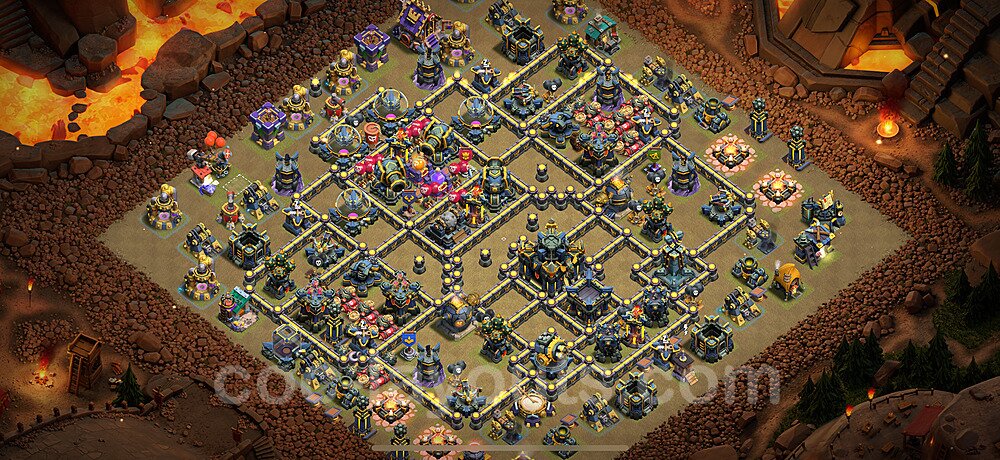 This Town Hall 17 war base is specifically designed to defend against 2-star and 3-star attacks in Clan Wars and Clan War Leagues. The strategic placement of defenses creates multiple compartments that force attackers to use more troops and spells than anticipated. Key defensive structures like Eagle Artillery, Inferno Towers, and X-Bows are positioned to cover crucial sections of the base, making it extremely difficult for opponents to secure a perfect attack. The core of this war base features a centralized Town Hall and Clan Castle, protected by multiple layers of walls and high-damage defenses. This layout forces attackers to commit significant resources just to reach the center, often leaving them without enough firepower to secure the Town Hall destruction. The anti-2-star design ensures that even if attackers breach the outer defenses, they'll struggle to achieve a 50% destruction rating. Air defenses are strategically spread to counter popular air attack strategies like LaLoon (Lava Hound + Balloons) and Electrone (Electro Dragons + Stone Slammer). The symmetrical trap placement and strategic Hidden Tesla positions create deadly surprise elements that can completely derail an attacker's plan. This base has been tested against various meta attack strategies and has consistently proven effective in preventing 3-star attacks.