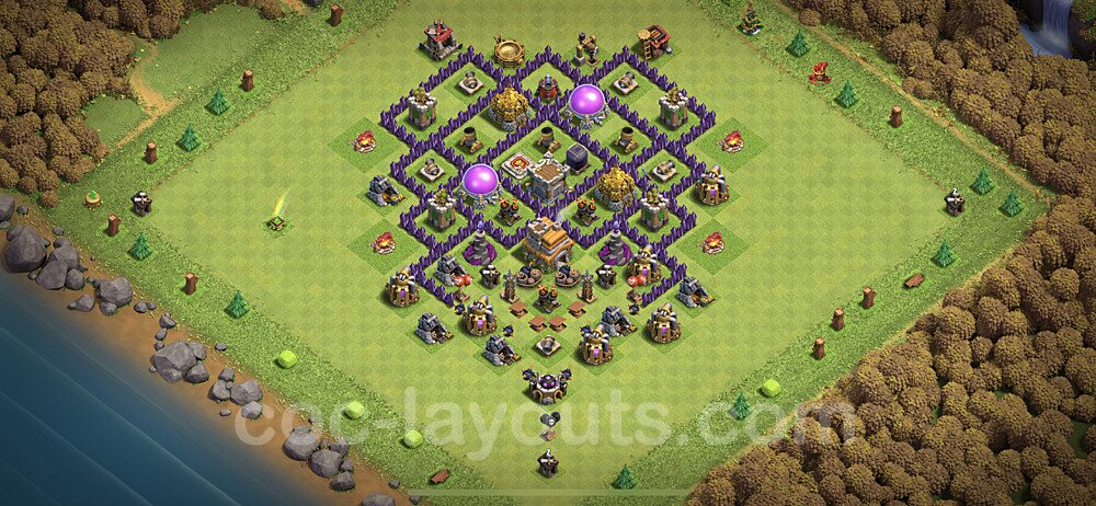 This Town Hall 7 hybrid base offers the best of both worlds - strong resource protection combined with effective trophy defense. The versatile design makes it an excellent choice for players who want to protect their loot while maintaining their trophy count. This balanced approach ensures you don't sacrifice one aspect of defense for another, making it ideal for active players across all league levels. The hybrid layout features centralized resource storages alongside a well-protected Town Hall, with multiple defensive layers that deter both farming raids and trophy pushers. High-value targets are strategically positioned within overlapping defense ranges, forcing attackers to make difficult choices about which objectives to prioritize. The compartmentalized design prevents attackers from easily achieving both loot destruction and the Town Hall kill in a single attack. Defense placement in this hybrid base creates strong coverage against both ground and air attacks. Inferno Towers, X-Bows, and Eagle Artillery work in concert to eliminate threats quickly, while splash damage defenses like Wizard Towers and Bomb Towers counter swarm strategies. The base's funnel-resistant design and strategic trap placement make it effective against popular attack strategies including QC LaLoon (Queen Charge Lava Hound Balloon), Blizzard attacks, and Yeti Smash compositions.