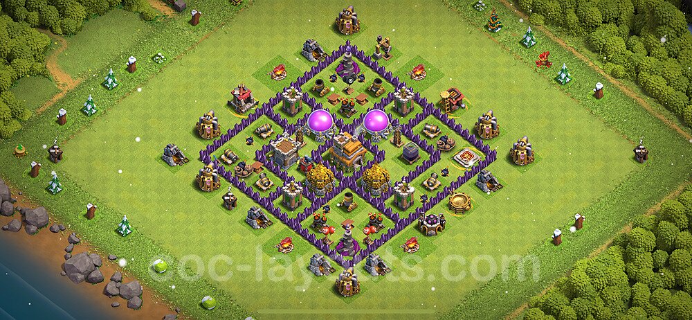 This Town Hall 7 hybrid base offers the best of both worlds - strong resource protection combined with effective trophy defense. The versatile design makes it an excellent choice for players who want to protect their loot while maintaining their trophy count. This balanced approach ensures you don't sacrifice one aspect of defense for another, making it ideal for active players across all league levels. The hybrid layout features centralized resource storages alongside a well-protected Town Hall, with multiple defensive layers that deter both farming raids and trophy pushers. High-value targets are strategically positioned within overlapping defense ranges, forcing attackers to make difficult choices about which objectives to prioritize. The compartmentalized design prevents attackers from easily achieving both loot destruction and the Town Hall kill in a single attack. Defense placement in this hybrid base creates strong coverage against both ground and air attacks. Inferno Towers, X-Bows, and Eagle Artillery work in concert to eliminate threats quickly, while splash damage defenses like Wizard Towers and Bomb Towers counter swarm strategies. The base's funnel-resistant design and strategic trap placement make it effective against popular attack strategies including QC LaLoon (Queen Charge Lava Hound Balloon), Blizzard attacks, and Yeti Smash compositions.
