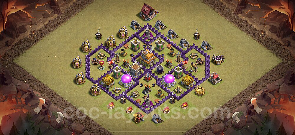 This Town Hall 7 war base is specifically designed to defend against 2-star and 3-star attacks in Clan Wars and Clan War Leagues. The strategic placement of defenses creates multiple compartments that force attackers to use more troops and spells than anticipated. Key defensive structures like Eagle Artillery, Inferno Towers, and X-Bows are positioned to cover crucial sections of the base, making it extremely difficult for opponents to secure a perfect attack. The core of this war base features a centralized Town Hall and Clan Castle, protected by multiple layers of walls and high-damage defenses. This layout forces attackers to commit significant resources just to reach the center, often leaving them without enough firepower to secure the Town Hall destruction. The anti-2-star design ensures that even if attackers breach the outer defenses, they'll struggle to achieve a 50% destruction rating. Air defenses are strategically spread to counter popular air attack strategies like LaLoon (Lava Hound + Balloons) and Electrone (Electro Dragons + Stone Slammer). The symmetrical trap placement and strategic Hidden Tesla positions create deadly surprise elements that can completely derail an attacker's plan. This base has been tested against various meta attack strategies and has consistently proven effective in preventing 3-star attacks.