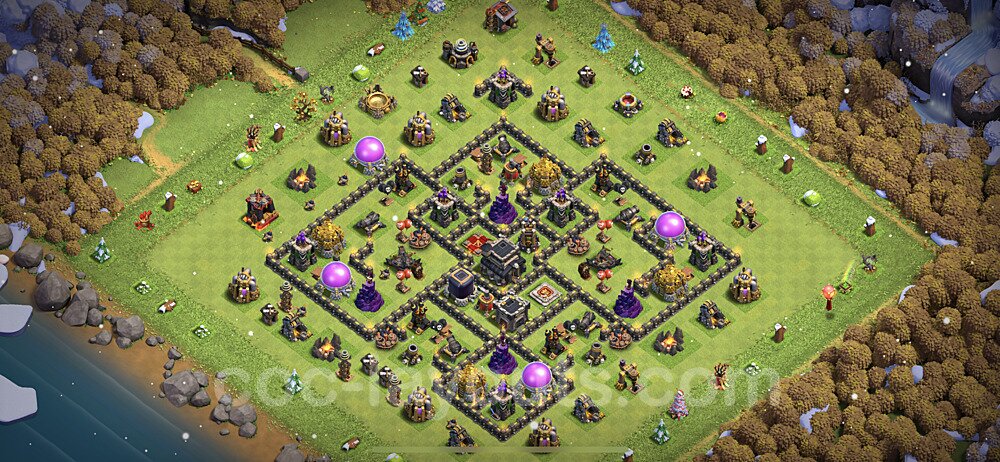 This Town Hall 9 war base is specifically designed to defend against 2-star and 3-star attacks in Clan Wars and Clan War Leagues. The strategic placement of defenses creates multiple compartments that force attackers to use more troops and spells than anticipated. Key defensive structures like Eagle Artillery, Inferno Towers, and X-Bows are positioned to cover crucial sections of the base, making it extremely difficult for opponents to secure a perfect attack. The core of this war base features a centralized Town Hall and Clan Castle, protected by multiple layers of walls and high-damage defenses. This layout forces attackers to commit significant resources just to reach the center, often leaving them without enough firepower to secure the Town Hall destruction. The anti-2-star design ensures that even if attackers breach the outer defenses, they'll struggle to achieve a 50% destruction rating. Air defenses are strategically spread to counter popular air attack strategies like LaLoon (Lava Hound + Balloons) and Electrone (Electro Dragons + Stone Slammer). The symmetrical trap placement and strategic Hidden Tesla positions create deadly surprise elements that can completely derail an attacker's plan. This base has been tested against various meta attack strategies and has consistently proven effective in preventing 3-star attacks.