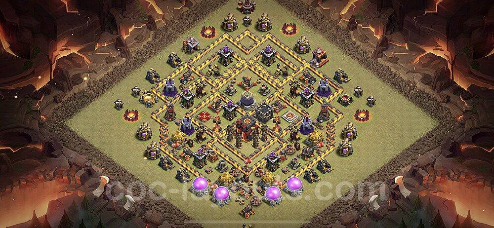This Town Hall 10 war base is specifically designed to defend against 2-star and 3-star attacks in Clan Wars and Clan War Leagues. The strategic placement of defenses creates multiple compartments that force attackers to use more troops and spells than anticipated. Key defensive structures like Eagle Artillery, Inferno Towers, and X-Bows are positioned to cover crucial sections of the base, making it extremely difficult for opponents to secure a perfect attack. The core of this war base features a centralized Town Hall and Clan Castle, protected by multiple layers of walls and high-damage defenses. This layout forces attackers to commit significant resources just to reach the center, often leaving them without enough firepower to secure the Town Hall destruction. The anti-2-star design ensures that even if attackers breach the outer defenses, they'll struggle to achieve a 50% destruction rating. Air defenses are strategically spread to counter popular air attack strategies like LaLoon (Lava Hound + Balloons) and Electrone (Electro Dragons + Stone Slammer). The symmetrical trap placement and strategic Hidden Tesla positions create deadly surprise elements that can completely derail an attacker's plan. This base has been tested against various meta attack strategies and has consistently proven effective in preventing 3-star attacks.