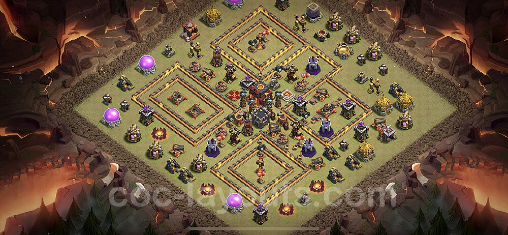 This Town Hall 10 war base is specifically designed to defend against 2-star and 3-star attacks in Clan Wars and Clan War Leagues. The strategic placement of defenses creates multiple compartments that force attackers to use more troops and spells than anticipated. Key defensive structures like Eagle Artillery, Inferno Towers, and X-Bows are positioned to cover crucial sections of the base, making it extremely difficult for opponents to secure a perfect attack. The core of this war base features a centralized Town Hall and Clan Castle, protected by multiple layers of walls and high-damage defenses. This layout forces attackers to commit significant resources just to reach the center, often leaving them without enough firepower to secure the Town Hall destruction. The anti-2-star design ensures that even if attackers breach the outer defenses, they'll struggle to achieve a 50% destruction rating. Air defenses are strategically spread to counter popular air attack strategies like LaLoon (Lava Hound + Balloons) and Electrone (Electro Dragons + Stone Slammer). The symmetrical trap placement and strategic Hidden Tesla positions create deadly surprise elements that can completely derail an attacker's plan. This base has been tested against various meta attack strategies and has consistently proven effective in preventing 3-star attacks.