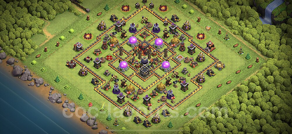 This Town Hall 10 hybrid base offers the best of both worlds - strong resource protection combined with effective trophy defense. The versatile design makes it an excellent choice for players who want to protect their loot while maintaining their trophy count. This balanced approach ensures you don't sacrifice one aspect of defense for another, making it ideal for active players across all league levels. The hybrid layout features centralized resource storages alongside a well-protected Town Hall, with multiple defensive layers that deter both farming raids and trophy pushers. High-value targets are strategically positioned within overlapping defense ranges, forcing attackers to make difficult choices about which objectives to prioritize. The compartmentalized design prevents attackers from easily achieving both loot destruction and the Town Hall kill in a single attack. Defense placement in this hybrid base creates strong coverage against both ground and air attacks. Inferno Towers, X-Bows, and Eagle Artillery work in concert to eliminate threats quickly, while splash damage defenses like Wizard Towers and Bomb Towers counter swarm strategies. The base's funnel-resistant design and strategic trap placement make it effective against popular attack strategies including QC LaLoon (Queen Charge Lava Hound Balloon), Blizzard attacks, and Yeti Smash compositions.