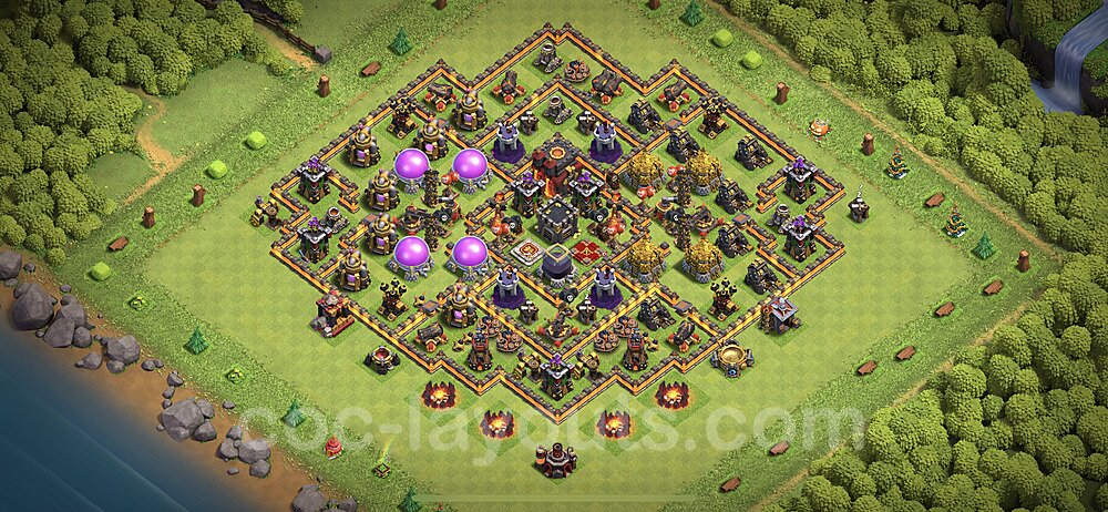This Town Hall 10 hybrid base offers the best of both worlds - strong resource protection combined with effective trophy defense. The versatile design makes it an excellent choice for players who want to protect their loot while maintaining their trophy count. This balanced approach ensures you don't sacrifice one aspect of defense for another, making it ideal for active players across all league levels. The hybrid layout features centralized resource storages alongside a well-protected Town Hall, with multiple defensive layers that deter both farming raids and trophy pushers. High-value targets are strategically positioned within overlapping defense ranges, forcing attackers to make difficult choices about which objectives to prioritize. The compartmentalized design prevents attackers from easily achieving both loot destruction and the Town Hall kill in a single attack. Defense placement in this hybrid base creates strong coverage against both ground and air attacks. Inferno Towers, X-Bows, and Eagle Artillery work in concert to eliminate threats quickly, while splash damage defenses like Wizard Towers and Bomb Towers counter swarm strategies. The base's funnel-resistant design and strategic trap placement make it effective against popular attack strategies including QC LaLoon (Queen Charge Lava Hound Balloon), Blizzard attacks, and Yeti Smash compositions.
