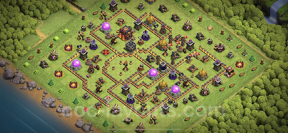 This Town Hall 10 war base is specifically designed to defend against 2-star and 3-star attacks in Clan Wars and Clan War Leagues. The strategic placement of defenses creates multiple compartments that force attackers to use more troops and spells than anticipated. Key defensive structures like Eagle Artillery, Inferno Towers, and X-Bows are positioned to cover crucial sections of the base, making it extremely difficult for opponents to secure a perfect attack. The core of this war base features a centralized Town Hall and Clan Castle, protected by multiple layers of walls and high-damage defenses. This layout forces attackers to commit significant resources just to reach the center, often leaving them without enough firepower to secure the Town Hall destruction. The anti-2-star design ensures that even if attackers breach the outer defenses, they'll struggle to achieve a 50% destruction rating. Air defenses are strategically spread to counter popular air attack strategies like LaLoon (Lava Hound + Balloons) and Electrone (Electro Dragons + Stone Slammer). The symmetrical trap placement and strategic Hidden Tesla positions create deadly surprise elements that can completely derail an attacker's plan. This base has been tested against various meta attack strategies and has consistently proven effective in preventing 3-star attacks.