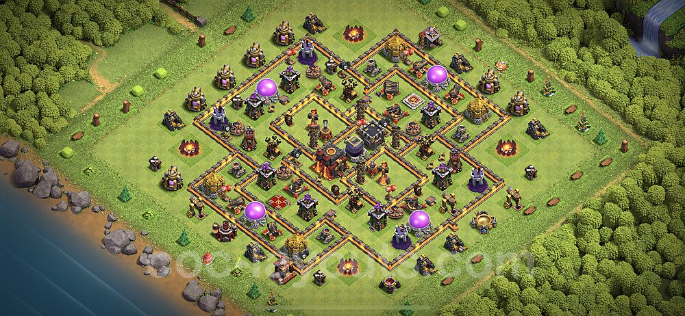 This Town Hall 10 hybrid base offers the best of both worlds - strong resource protection combined with effective trophy defense. The versatile design makes it an excellent choice for players who want to protect their loot while maintaining their trophy count. This balanced approach ensures you don't sacrifice one aspect of defense for another, making it ideal for active players across all league levels. The hybrid layout features centralized resource storages alongside a well-protected Town Hall, with multiple defensive layers that deter both farming raids and trophy pushers. High-value targets are strategically positioned within overlapping defense ranges, forcing attackers to make difficult choices about which objectives to prioritize. The compartmentalized design prevents attackers from easily achieving both loot destruction and the Town Hall kill in a single attack. Defense placement in this hybrid base creates strong coverage against both ground and air attacks. Inferno Towers, X-Bows, and Eagle Artillery work in concert to eliminate threats quickly, while splash damage defenses like Wizard Towers and Bomb Towers counter swarm strategies. The base's funnel-resistant design and strategic trap placement make it effective against popular attack strategies including QC LaLoon (Queen Charge Lava Hound Balloon), Blizzard attacks, and Yeti Smash compositions.