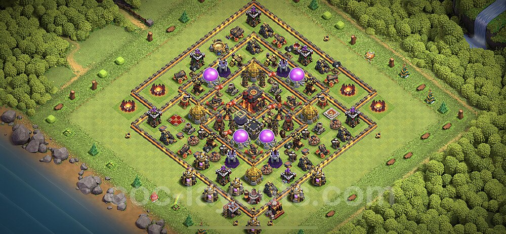 This Town Hall 10 hybrid base offers the best of both worlds - strong resource protection combined with effective trophy defense. The versatile design makes it an excellent choice for players who want to protect their loot while maintaining their trophy count. This balanced approach ensures you don't sacrifice one aspect of defense for another, making it ideal for active players across all league levels. The hybrid layout features centralized resource storages alongside a well-protected Town Hall, with multiple defensive layers that deter both farming raids and trophy pushers. High-value targets are strategically positioned within overlapping defense ranges, forcing attackers to make difficult choices about which objectives to prioritize. The compartmentalized design prevents attackers from easily achieving both loot destruction and the Town Hall kill in a single attack. Defense placement in this hybrid base creates strong coverage against both ground and air attacks. Inferno Towers, X-Bows, and Eagle Artillery work in concert to eliminate threats quickly, while splash damage defenses like Wizard Towers and Bomb Towers counter swarm strategies. The base's funnel-resistant design and strategic trap placement make it effective against popular attack strategies including QC LaLoon (Queen Charge Lava Hound Balloon), Blizzard attacks, and Yeti Smash compositions.