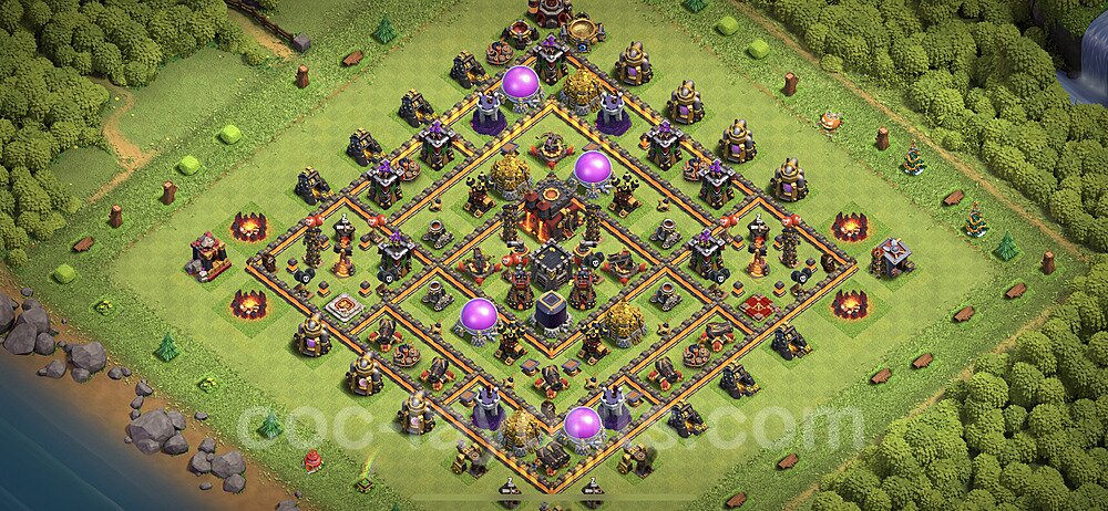 This Town Hall 10 hybrid base offers the best of both worlds - strong resource protection combined with effective trophy defense. The versatile design makes it an excellent choice for players who want to protect their loot while maintaining their trophy count. This balanced approach ensures you don't sacrifice one aspect of defense for another, making it ideal for active players across all league levels. The hybrid layout features centralized resource storages alongside a well-protected Town Hall, with multiple defensive layers that deter both farming raids and trophy pushers. High-value targets are strategically positioned within overlapping defense ranges, forcing attackers to make difficult choices about which objectives to prioritize. The compartmentalized design prevents attackers from easily achieving both loot destruction and the Town Hall kill in a single attack. Defense placement in this hybrid base creates strong coverage against both ground and air attacks. Inferno Towers, X-Bows, and Eagle Artillery work in concert to eliminate threats quickly, while splash damage defenses like Wizard Towers and Bomb Towers counter swarm strategies. The base's funnel-resistant design and strategic trap placement make it effective against popular attack strategies including QC LaLoon (Queen Charge Lava Hound Balloon), Blizzard attacks, and Yeti Smash compositions.