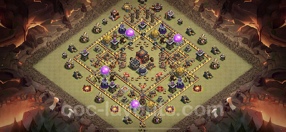 This Town Hall 10 hybrid base offers the best of both worlds - strong resource protection combined with effective trophy defense. The versatile design makes it an excellent choice for players who want to protect their loot while maintaining their trophy count. This balanced approach ensures you don't sacrifice one aspect of defense for another, making it ideal for active players across all league levels. The hybrid layout features centralized resource storages alongside a well-protected Town Hall, with multiple defensive layers that deter both farming raids and trophy pushers. High-value targets are strategically positioned within overlapping defense ranges, forcing attackers to make difficult choices about which objectives to prioritize. The compartmentalized design prevents attackers from easily achieving both loot destruction and the Town Hall kill in a single attack. Defense placement in this hybrid base creates strong coverage against both ground and air attacks. Inferno Towers, X-Bows, and Eagle Artillery work in concert to eliminate threats quickly, while splash damage defenses like Wizard Towers and Bomb Towers counter swarm strategies. The base's funnel-resistant design and strategic trap placement make it effective against popular attack strategies including QC LaLoon (Queen Charge Lava Hound Balloon), Blizzard attacks, and Yeti Smash compositions.