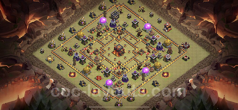 This Town Hall 10 hybrid base offers the best of both worlds - strong resource protection combined with effective trophy defense. The versatile design makes it an excellent choice for players who want to protect their loot while maintaining their trophy count. This balanced approach ensures you don't sacrifice one aspect of defense for another, making it ideal for active players across all league levels. The hybrid layout features centralized resource storages alongside a well-protected Town Hall, with multiple defensive layers that deter both farming raids and trophy pushers. High-value targets are strategically positioned within overlapping defense ranges, forcing attackers to make difficult choices about which objectives to prioritize. The compartmentalized design prevents attackers from easily achieving both loot destruction and the Town Hall kill in a single attack. Defense placement in this hybrid base creates strong coverage against both ground and air attacks. Inferno Towers, X-Bows, and Eagle Artillery work in concert to eliminate threats quickly, while splash damage defenses like Wizard Towers and Bomb Towers counter swarm strategies. The base's funnel-resistant design and strategic trap placement make it effective against popular attack strategies including QC LaLoon (Queen Charge Lava Hound Balloon), Blizzard attacks, and Yeti Smash compositions.