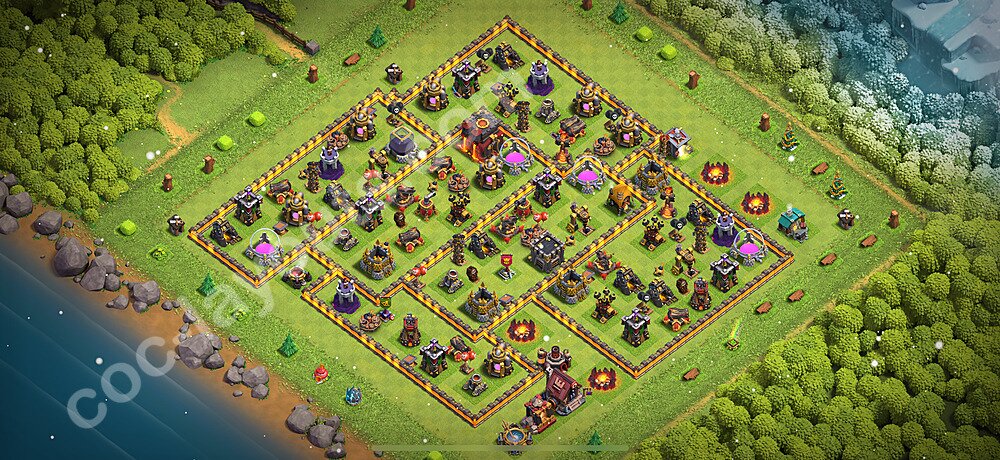 This Town Hall 10 farming base is optimized to protect your resources including Gold, Elixir, and Dark Elixir from raiders. The layout features centralized storages with multiple compartments that make it extremely difficult for attackers to steal large amounts of resources in a single raid. This design philosophy prioritizes resource protection over trophies, making it ideal for players focused on upgrading their village. The strategic placement of resource storages ensures they are well-protected by high-damage defenses like X-Bows, Inferno Towers, and Eagle Artillery. Each storage is surrounded by multiple wall layers and defensive structures, forcing attackers to invest heavily in troops and spells to reach your loot. The farming base design also incorporates strategic dead zones where attackers' troops tend to path inefficiently, wasting time and taking heavy damage from nearby defenses. Collectors and mines are positioned on the outer edges as "bait" while your main storages remain heavily protected in the core. This layout has proven effective against common farming strategies like BARCH (Barbarians + Archers), GoWiPe (Golems + Wizards + Pekka), and mass Miner attacks. The compartmentalized design prevents attackers from funneling straight to your resources, ensuring you maintain your hard-earned loot for important upgrades.