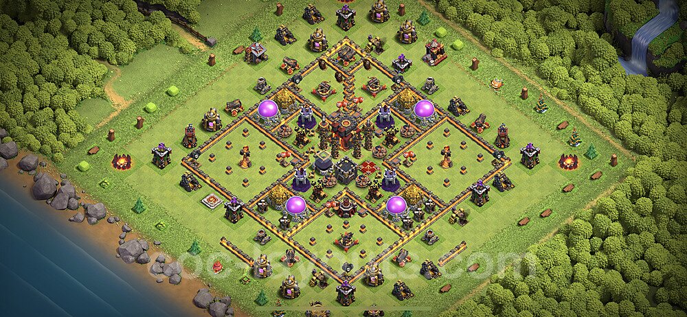 This Town Hall 10 farming base is optimized to protect your resources including Gold, Elixir, and Dark Elixir from raiders. The layout features centralized storages with multiple compartments that make it extremely difficult for attackers to steal large amounts of resources in a single raid. This design philosophy prioritizes resource protection over trophies, making it ideal for players focused on upgrading their village. The strategic placement of resource storages ensures they are well-protected by high-damage defenses like X-Bows, Inferno Towers, and Eagle Artillery. Each storage is surrounded by multiple wall layers and defensive structures, forcing attackers to invest heavily in troops and spells to reach your loot. The farming base design also incorporates strategic dead zones where attackers' troops tend to path inefficiently, wasting time and taking heavy damage from nearby defenses. Collectors and mines are positioned on the outer edges as "bait" while your main storages remain heavily protected in the core. This layout has proven effective against common farming strategies like BARCH (Barbarians + Archers), GoWiPe (Golems + Wizards + Pekka), and mass Miner attacks. The compartmentalized design prevents attackers from funneling straight to your resources, ensuring you maintain your hard-earned loot for important upgrades.