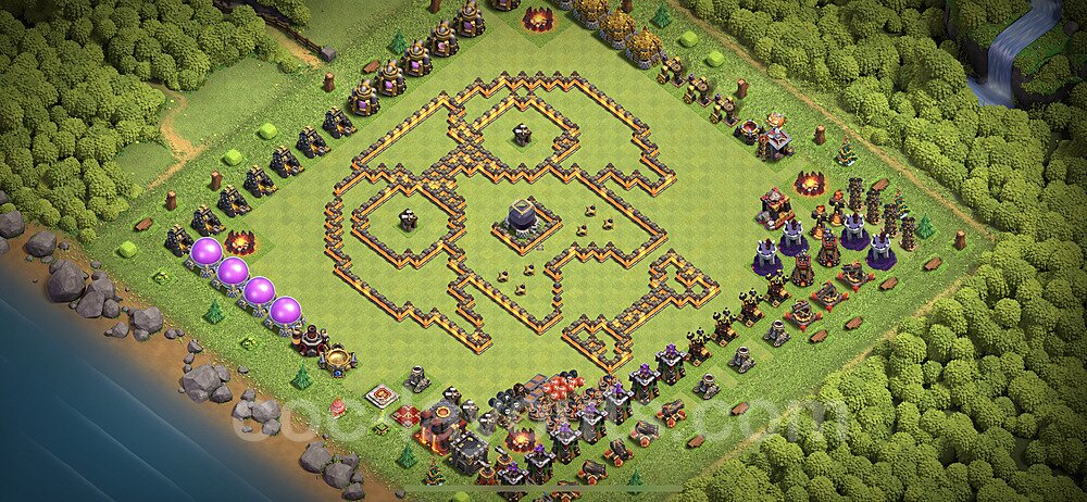 This Town Hall 10 war base is specifically designed to defend against 2-star and 3-star attacks in Clan Wars and Clan War Leagues. The strategic placement of defenses creates multiple compartments that force attackers to use more troops and spells than anticipated. Key defensive structures like Eagle Artillery, Inferno Towers, and X-Bows are positioned to cover crucial sections of the base, making it extremely difficult for opponents to secure a perfect attack. The core of this war base features a centralized Town Hall and Clan Castle, protected by multiple layers of walls and high-damage defenses. This layout forces attackers to commit significant resources just to reach the center, often leaving them without enough firepower to secure the Town Hall destruction. The anti-2-star design ensures that even if attackers breach the outer defenses, they'll struggle to achieve a 50% destruction rating. Air defenses are strategically spread to counter popular air attack strategies like LaLoon (Lava Hound + Balloons) and Electrone (Electro Dragons + Stone Slammer). The symmetrical trap placement and strategic Hidden Tesla positions create deadly surprise elements that can completely derail an attacker's plan. This base has been tested against various meta attack strategies and has consistently proven effective in preventing 3-star attacks.