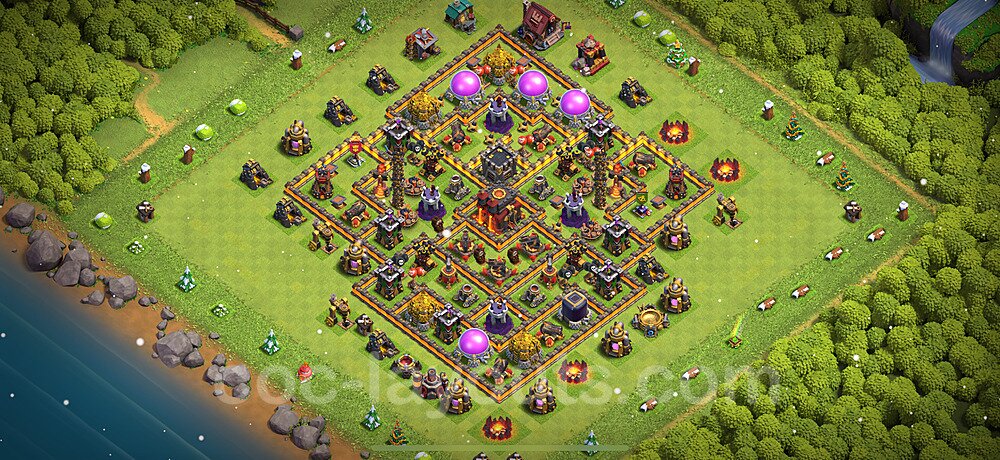 This Town Hall 10 trophy pushing base is engineered for maximum defensive capability to help you climb and maintain higher trophy leagues. The design focuses on preventing attackers from achieving the 50% destruction threshold needed to steal trophies, with a heavily fortified Town Hall position and anti-2-star compartmentalization. This layout is perfect for competitive players aiming to reach Champion, Titan, or Legend League. The strategic placement of defenses creates overlapping coverage that makes it nearly impossible for attackers to access the core without facing devastating firepower. High-DPS defenses like Inferno Towers and Eagle Artillery are positioned to protect the Town Hall from all angles, while splash damage defenses counter mass troop strategies. The anti-air coverage is exceptionally strong, with Air Defenses, Air Sweepers, and Wizard Towers positioned to eliminate aerial threats quickly. Trap placement in this trophy base is optimized to counter popular attack strategies seen in higher leagues. Spring Traps are positioned to eliminate Hog Riders and Valkyries, while Giant Bombs target Balloons and Wall Breakers. The base's asymmetrical design confuses attackers' pathing algorithms, causing troops to split and take unnecessary damage. This layout has been battle-tested in Legend League and has consistently helped players maintain their trophies against skilled attackers.