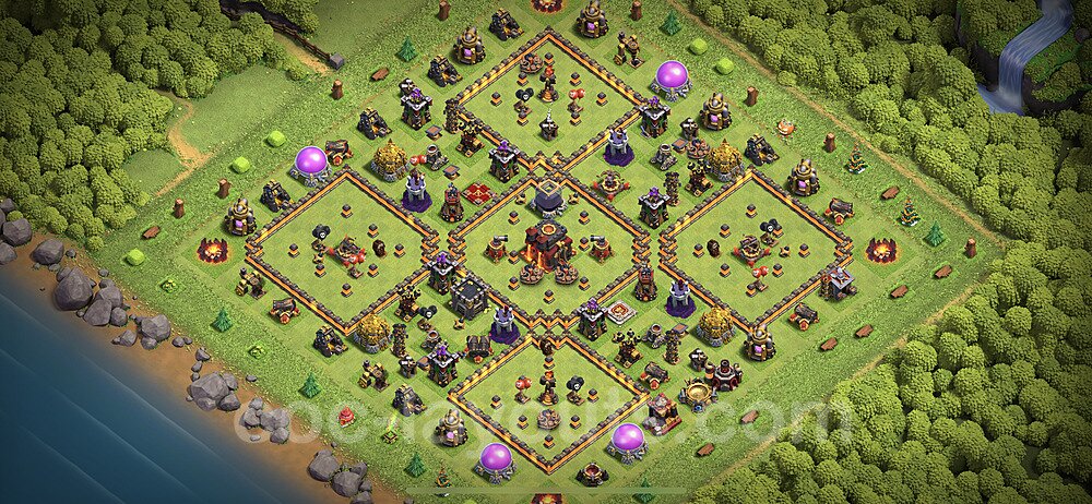 This Town Hall 10 war base is specifically designed to defend against 2-star and 3-star attacks in Clan Wars and Clan War Leagues. The strategic placement of defenses creates multiple compartments that force attackers to use more troops and spells than anticipated. Key defensive structures like Eagle Artillery, Inferno Towers, and X-Bows are positioned to cover crucial sections of the base, making it extremely difficult for opponents to secure a perfect attack. The core of this war base features a centralized Town Hall and Clan Castle, protected by multiple layers of walls and high-damage defenses. This layout forces attackers to commit significant resources just to reach the center, often leaving them without enough firepower to secure the Town Hall destruction. The anti-2-star design ensures that even if attackers breach the outer defenses, they'll struggle to achieve a 50% destruction rating. Air defenses are strategically spread to counter popular air attack strategies like LaLoon (Lava Hound + Balloons) and Electrone (Electro Dragons + Stone Slammer). The symmetrical trap placement and strategic Hidden Tesla positions create deadly surprise elements that can completely derail an attacker's plan. This base has been tested against various meta attack strategies and has consistently proven effective in preventing 3-star attacks.