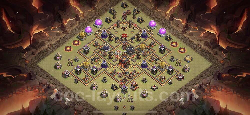 This Town Hall 10 war base is specifically designed to defend against 2-star and 3-star attacks in Clan Wars and Clan War Leagues. The strategic placement of defenses creates multiple compartments that force attackers to use more troops and spells than anticipated. Key defensive structures like Eagle Artillery, Inferno Towers, and X-Bows are positioned to cover crucial sections of the base, making it extremely difficult for opponents to secure a perfect attack. The core of this war base features a centralized Town Hall and Clan Castle, protected by multiple layers of walls and high-damage defenses. This layout forces attackers to commit significant resources just to reach the center, often leaving them without enough firepower to secure the Town Hall destruction. The anti-2-star design ensures that even if attackers breach the outer defenses, they'll struggle to achieve a 50% destruction rating. Air defenses are strategically spread to counter popular air attack strategies like LaLoon (Lava Hound + Balloons) and Electrone (Electro Dragons + Stone Slammer). The symmetrical trap placement and strategic Hidden Tesla positions create deadly surprise elements that can completely derail an attacker's plan. This base has been tested against various meta attack strategies and has consistently proven effective in preventing 3-star attacks.