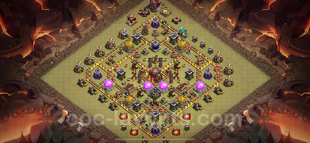 This Town Hall 10 war base is specifically designed to defend against 2-star and 3-star attacks in Clan Wars and Clan War Leagues. The strategic placement of defenses creates multiple compartments that force attackers to use more troops and spells than anticipated. Key defensive structures like Eagle Artillery, Inferno Towers, and X-Bows are positioned to cover crucial sections of the base, making it extremely difficult for opponents to secure a perfect attack. The core of this war base features a centralized Town Hall and Clan Castle, protected by multiple layers of walls and high-damage defenses. This layout forces attackers to commit significant resources just to reach the center, often leaving them without enough firepower to secure the Town Hall destruction. The anti-2-star design ensures that even if attackers breach the outer defenses, they'll struggle to achieve a 50% destruction rating. Air defenses are strategically spread to counter popular air attack strategies like LaLoon (Lava Hound + Balloons) and Electrone (Electro Dragons + Stone Slammer). The symmetrical trap placement and strategic Hidden Tesla positions create deadly surprise elements that can completely derail an attacker's plan. This base has been tested against various meta attack strategies and has consistently proven effective in preventing 3-star attacks.