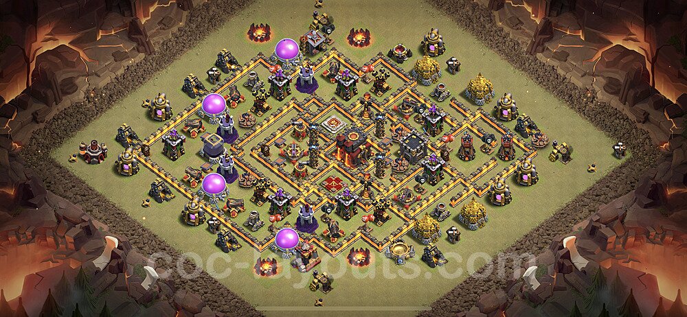 This Town Hall 10 war base is specifically designed to defend against 2-star and 3-star attacks in Clan Wars and Clan War Leagues. The strategic placement of defenses creates multiple compartments that force attackers to use more troops and spells than anticipated. Key defensive structures like Eagle Artillery, Inferno Towers, and X-Bows are positioned to cover crucial sections of the base, making it extremely difficult for opponents to secure a perfect attack. The core of this war base features a centralized Town Hall and Clan Castle, protected by multiple layers of walls and high-damage defenses. This layout forces attackers to commit significant resources just to reach the center, often leaving them without enough firepower to secure the Town Hall destruction. The anti-2-star design ensures that even if attackers breach the outer defenses, they'll struggle to achieve a 50% destruction rating. Air defenses are strategically spread to counter popular air attack strategies like LaLoon (Lava Hound + Balloons) and Electrone (Electro Dragons + Stone Slammer). The symmetrical trap placement and strategic Hidden Tesla positions create deadly surprise elements that can completely derail an attacker's plan. This base has been tested against various meta attack strategies and has consistently proven effective in preventing 3-star attacks.