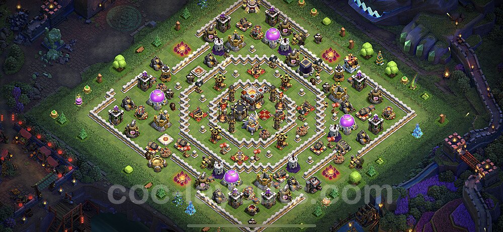 This Town Hall 11 war base is specifically designed to defend against 2-star and 3-star attacks in Clan Wars and Clan War Leagues. The strategic placement of defenses creates multiple compartments that force attackers to use more troops and spells than anticipated. Key defensive structures like Eagle Artillery, Inferno Towers, and X-Bows are positioned to cover crucial sections of the base, making it extremely difficult for opponents to secure a perfect attack. The core of this war base features a centralized Town Hall and Clan Castle, protected by multiple layers of walls and high-damage defenses. This layout forces attackers to commit significant resources just to reach the center, often leaving them without enough firepower to secure the Town Hall destruction. The anti-2-star design ensures that even if attackers breach the outer defenses, they'll struggle to achieve a 50% destruction rating. Air defenses are strategically spread to counter popular air attack strategies like LaLoon (Lava Hound + Balloons) and Electrone (Electro Dragons + Stone Slammer). The symmetrical trap placement and strategic Hidden Tesla positions create deadly surprise elements that can completely derail an attacker's plan. This base has been tested against various meta attack strategies and has consistently proven effective in preventing 3-star attacks.