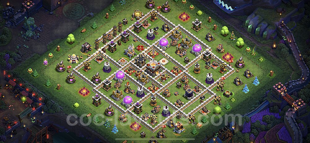 This Town Hall 11 war base is specifically designed to defend against 2-star and 3-star attacks in Clan Wars and Clan War Leagues. The strategic placement of defenses creates multiple compartments that force attackers to use more troops and spells than anticipated. Key defensive structures like Eagle Artillery, Inferno Towers, and X-Bows are positioned to cover crucial sections of the base, making it extremely difficult for opponents to secure a perfect attack. The core of this war base features a centralized Town Hall and Clan Castle, protected by multiple layers of walls and high-damage defenses. This layout forces attackers to commit significant resources just to reach the center, often leaving them without enough firepower to secure the Town Hall destruction. The anti-2-star design ensures that even if attackers breach the outer defenses, they'll struggle to achieve a 50% destruction rating. Air defenses are strategically spread to counter popular air attack strategies like LaLoon (Lava Hound + Balloons) and Electrone (Electro Dragons + Stone Slammer). The symmetrical trap placement and strategic Hidden Tesla positions create deadly surprise elements that can completely derail an attacker's plan. This base has been tested against various meta attack strategies and has consistently proven effective in preventing 3-star attacks.