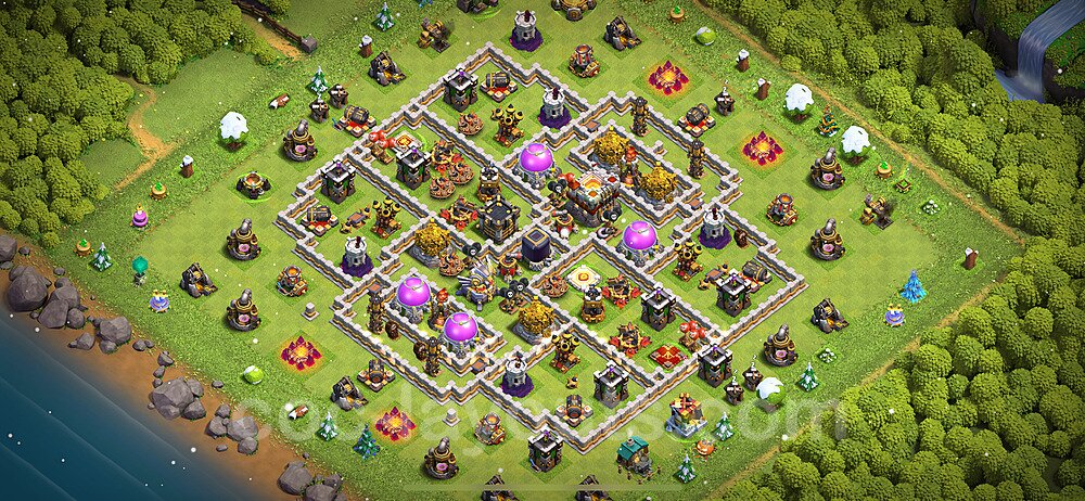 This Town Hall 11 farming base is optimized to protect your resources including Gold, Elixir, and Dark Elixir from raiders. The layout features centralized storages with multiple compartments that make it extremely difficult for attackers to steal large amounts of resources in a single raid. This design philosophy prioritizes resource protection over trophies, making it ideal for players focused on upgrading their village. The strategic placement of resource storages ensures they are well-protected by high-damage defenses like X-Bows, Inferno Towers, and Eagle Artillery. Each storage is surrounded by multiple wall layers and defensive structures, forcing attackers to invest heavily in troops and spells to reach your loot. The farming base design also incorporates strategic dead zones where attackers' troops tend to path inefficiently, wasting time and taking heavy damage from nearby defenses. Collectors and mines are positioned on the outer edges as "bait" while your main storages remain heavily protected in the core. This layout has proven effective against common farming strategies like BARCH (Barbarians + Archers), GoWiPe (Golems + Wizards + Pekka), and mass Miner attacks. The compartmentalized design prevents attackers from funneling straight to your resources, ensuring you maintain your hard-earned loot for important upgrades.