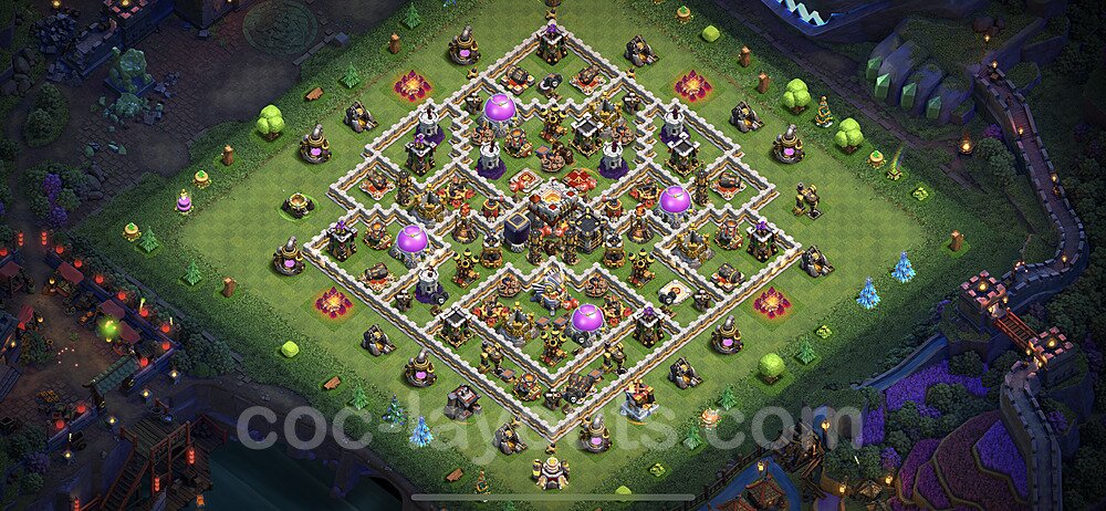 This Town Hall 11 hybrid base offers the best of both worlds - strong resource protection combined with effective trophy defense. The versatile design makes it an excellent choice for players who want to protect their loot while maintaining their trophy count. This balanced approach ensures you don't sacrifice one aspect of defense for another, making it ideal for active players across all league levels. The hybrid layout features centralized resource storages alongside a well-protected Town Hall, with multiple defensive layers that deter both farming raids and trophy pushers. High-value targets are strategically positioned within overlapping defense ranges, forcing attackers to make difficult choices about which objectives to prioritize. The compartmentalized design prevents attackers from easily achieving both loot destruction and the Town Hall kill in a single attack. Defense placement in this hybrid base creates strong coverage against both ground and air attacks. Inferno Towers, X-Bows, and Eagle Artillery work in concert to eliminate threats quickly, while splash damage defenses like Wizard Towers and Bomb Towers counter swarm strategies. The base's funnel-resistant design and strategic trap placement make it effective against popular attack strategies including QC LaLoon (Queen Charge Lava Hound Balloon), Blizzard attacks, and Yeti Smash compositions.