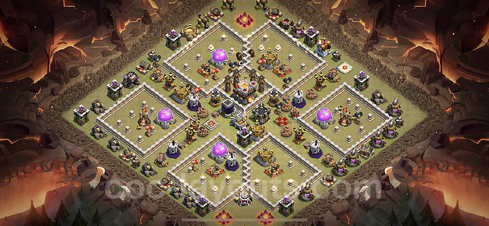 This Town Hall 11 hybrid base offers the best of both worlds - strong resource protection combined with effective trophy defense. The versatile design makes it an excellent choice for players who want to protect their loot while maintaining their trophy count. This balanced approach ensures you don't sacrifice one aspect of defense for another, making it ideal for active players across all league levels. The hybrid layout features centralized resource storages alongside a well-protected Town Hall, with multiple defensive layers that deter both farming raids and trophy pushers. High-value targets are strategically positioned within overlapping defense ranges, forcing attackers to make difficult choices about which objectives to prioritize. The compartmentalized design prevents attackers from easily achieving both loot destruction and the Town Hall kill in a single attack. Defense placement in this hybrid base creates strong coverage against both ground and air attacks. Inferno Towers, X-Bows, and Eagle Artillery work in concert to eliminate threats quickly, while splash damage defenses like Wizard Towers and Bomb Towers counter swarm strategies. The base's funnel-resistant design and strategic trap placement make it effective against popular attack strategies including QC LaLoon (Queen Charge Lava Hound Balloon), Blizzard attacks, and Yeti Smash compositions.