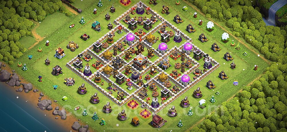 This Town Hall 11 hybrid base offers the best of both worlds - strong resource protection combined with effective trophy defense. The versatile design makes it an excellent choice for players who want to protect their loot while maintaining their trophy count. This balanced approach ensures you don't sacrifice one aspect of defense for another, making it ideal for active players across all league levels. The hybrid layout features centralized resource storages alongside a well-protected Town Hall, with multiple defensive layers that deter both farming raids and trophy pushers. High-value targets are strategically positioned within overlapping defense ranges, forcing attackers to make difficult choices about which objectives to prioritize. The compartmentalized design prevents attackers from easily achieving both loot destruction and the Town Hall kill in a single attack. Defense placement in this hybrid base creates strong coverage against both ground and air attacks. Inferno Towers, X-Bows, and Eagle Artillery work in concert to eliminate threats quickly, while splash damage defenses like Wizard Towers and Bomb Towers counter swarm strategies. The base's funnel-resistant design and strategic trap placement make it effective against popular attack strategies including QC LaLoon (Queen Charge Lava Hound Balloon), Blizzard attacks, and Yeti Smash compositions.
