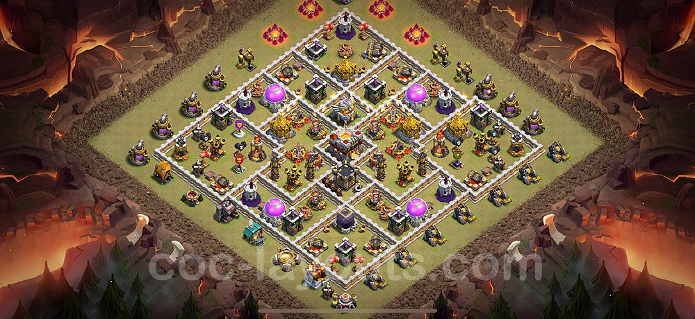 This Town Hall 11 hybrid base offers the best of both worlds - strong resource protection combined with effective trophy defense. The versatile design makes it an excellent choice for players who want to protect their loot while maintaining their trophy count. This balanced approach ensures you don't sacrifice one aspect of defense for another, making it ideal for active players across all league levels. The hybrid layout features centralized resource storages alongside a well-protected Town Hall, with multiple defensive layers that deter both farming raids and trophy pushers. High-value targets are strategically positioned within overlapping defense ranges, forcing attackers to make difficult choices about which objectives to prioritize. The compartmentalized design prevents attackers from easily achieving both loot destruction and the Town Hall kill in a single attack. Defense placement in this hybrid base creates strong coverage against both ground and air attacks. Inferno Towers, X-Bows, and Eagle Artillery work in concert to eliminate threats quickly, while splash damage defenses like Wizard Towers and Bomb Towers counter swarm strategies. The base's funnel-resistant design and strategic trap placement make it effective against popular attack strategies including QC LaLoon (Queen Charge Lava Hound Balloon), Blizzard attacks, and Yeti Smash compositions.