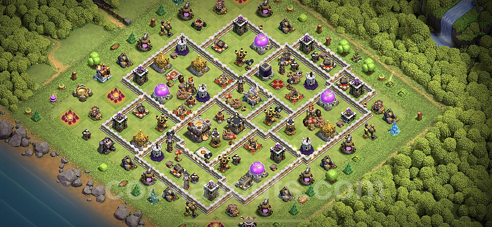 This Town Hall 11 hybrid base offers the best of both worlds - strong resource protection combined with effective trophy defense. The versatile design makes it an excellent choice for players who want to protect their loot while maintaining their trophy count. This balanced approach ensures you don't sacrifice one aspect of defense for another, making it ideal for active players across all league levels. The hybrid layout features centralized resource storages alongside a well-protected Town Hall, with multiple defensive layers that deter both farming raids and trophy pushers. High-value targets are strategically positioned within overlapping defense ranges, forcing attackers to make difficult choices about which objectives to prioritize. The compartmentalized design prevents attackers from easily achieving both loot destruction and the Town Hall kill in a single attack. Defense placement in this hybrid base creates strong coverage against both ground and air attacks. Inferno Towers, X-Bows, and Eagle Artillery work in concert to eliminate threats quickly, while splash damage defenses like Wizard Towers and Bomb Towers counter swarm strategies. The base's funnel-resistant design and strategic trap placement make it effective against popular attack strategies including QC LaLoon (Queen Charge Lava Hound Balloon), Blizzard attacks, and Yeti Smash compositions.