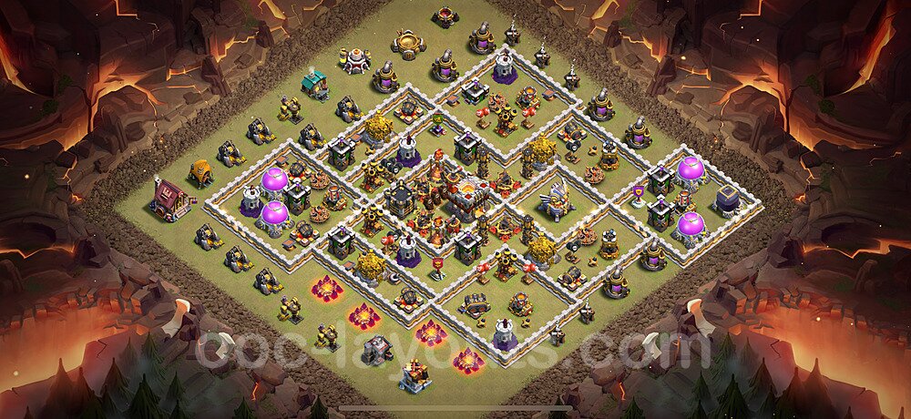 This Town Hall 11 hybrid base offers the best of both worlds - strong resource protection combined with effective trophy defense. The versatile design makes it an excellent choice for players who want to protect their loot while maintaining their trophy count. This balanced approach ensures you don't sacrifice one aspect of defense for another, making it ideal for active players across all league levels. The hybrid layout features centralized resource storages alongside a well-protected Town Hall, with multiple defensive layers that deter both farming raids and trophy pushers. High-value targets are strategically positioned within overlapping defense ranges, forcing attackers to make difficult choices about which objectives to prioritize. The compartmentalized design prevents attackers from easily achieving both loot destruction and the Town Hall kill in a single attack. Defense placement in this hybrid base creates strong coverage against both ground and air attacks. Inferno Towers, X-Bows, and Eagle Artillery work in concert to eliminate threats quickly, while splash damage defenses like Wizard Towers and Bomb Towers counter swarm strategies. The base's funnel-resistant design and strategic trap placement make it effective against popular attack strategies including QC LaLoon (Queen Charge Lava Hound Balloon), Blizzard attacks, and Yeti Smash compositions.