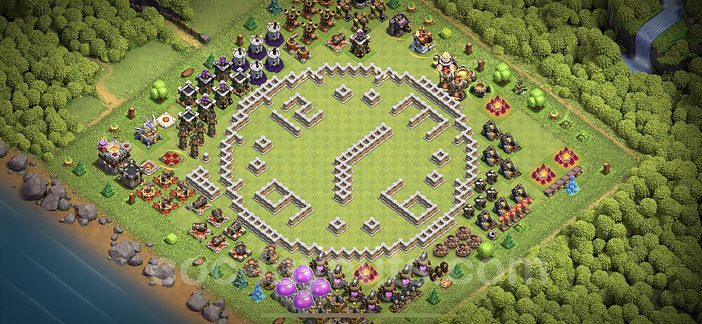 This Town Hall 11 war base is specifically designed to defend against 2-star and 3-star attacks in Clan Wars and Clan War Leagues. The strategic placement of defenses creates multiple compartments that force attackers to use more troops and spells than anticipated. Key defensive structures like Eagle Artillery, Inferno Towers, and X-Bows are positioned to cover crucial sections of the base, making it extremely difficult for opponents to secure a perfect attack. The core of this war base features a centralized Town Hall and Clan Castle, protected by multiple layers of walls and high-damage defenses. This layout forces attackers to commit significant resources just to reach the center, often leaving them without enough firepower to secure the Town Hall destruction. The anti-2-star design ensures that even if attackers breach the outer defenses, they'll struggle to achieve a 50% destruction rating. Air defenses are strategically spread to counter popular air attack strategies like LaLoon (Lava Hound + Balloons) and Electrone (Electro Dragons + Stone Slammer). The symmetrical trap placement and strategic Hidden Tesla positions create deadly surprise elements that can completely derail an attacker's plan. This base has been tested against various meta attack strategies and has consistently proven effective in preventing 3-star attacks.