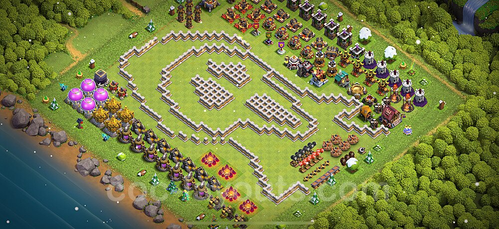This Town Hall 11 war base is specifically designed to defend against 2-star and 3-star attacks in Clan Wars and Clan War Leagues. The strategic placement of defenses creates multiple compartments that force attackers to use more troops and spells than anticipated. Key defensive structures like Eagle Artillery, Inferno Towers, and X-Bows are positioned to cover crucial sections of the base, making it extremely difficult for opponents to secure a perfect attack. The core of this war base features a centralized Town Hall and Clan Castle, protected by multiple layers of walls and high-damage defenses. This layout forces attackers to commit significant resources just to reach the center, often leaving them without enough firepower to secure the Town Hall destruction. The anti-2-star design ensures that even if attackers breach the outer defenses, they'll struggle to achieve a 50% destruction rating. Air defenses are strategically spread to counter popular air attack strategies like LaLoon (Lava Hound + Balloons) and Electrone (Electro Dragons + Stone Slammer). The symmetrical trap placement and strategic Hidden Tesla positions create deadly surprise elements that can completely derail an attacker's plan. This base has been tested against various meta attack strategies and has consistently proven effective in preventing 3-star attacks.