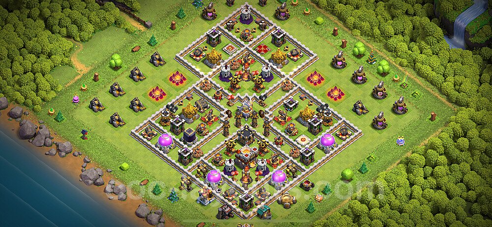 This Town Hall 11 war base is specifically designed to defend against 2-star and 3-star attacks in Clan Wars and Clan War Leagues. The strategic placement of defenses creates multiple compartments that force attackers to use more troops and spells than anticipated. Key defensive structures like Eagle Artillery, Inferno Towers, and X-Bows are positioned to cover crucial sections of the base, making it extremely difficult for opponents to secure a perfect attack. The core of this war base features a centralized Town Hall and Clan Castle, protected by multiple layers of walls and high-damage defenses. This layout forces attackers to commit significant resources just to reach the center, often leaving them without enough firepower to secure the Town Hall destruction. The anti-2-star design ensures that even if attackers breach the outer defenses, they'll struggle to achieve a 50% destruction rating. Air defenses are strategically spread to counter popular air attack strategies like LaLoon (Lava Hound + Balloons) and Electrone (Electro Dragons + Stone Slammer). The symmetrical trap placement and strategic Hidden Tesla positions create deadly surprise elements that can completely derail an attacker's plan. This base has been tested against various meta attack strategies and has consistently proven effective in preventing 3-star attacks.