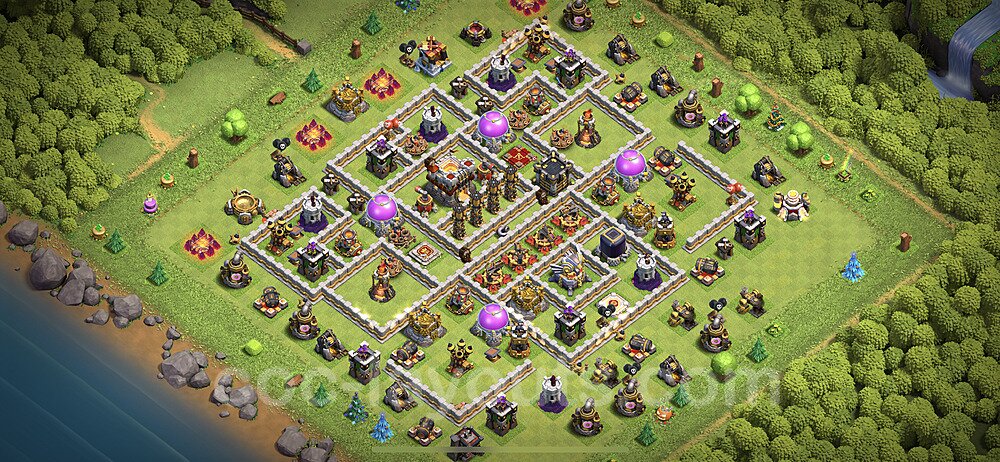 This Town Hall 11 war base is specifically designed to defend against 2-star and 3-star attacks in Clan Wars and Clan War Leagues. The strategic placement of defenses creates multiple compartments that force attackers to use more troops and spells than anticipated. Key defensive structures like Eagle Artillery, Inferno Towers, and X-Bows are positioned to cover crucial sections of the base, making it extremely difficult for opponents to secure a perfect attack. The core of this war base features a centralized Town Hall and Clan Castle, protected by multiple layers of walls and high-damage defenses. This layout forces attackers to commit significant resources just to reach the center, often leaving them without enough firepower to secure the Town Hall destruction. The anti-2-star design ensures that even if attackers breach the outer defenses, they'll struggle to achieve a 50% destruction rating. Air defenses are strategically spread to counter popular air attack strategies like LaLoon (Lava Hound + Balloons) and Electrone (Electro Dragons + Stone Slammer). The symmetrical trap placement and strategic Hidden Tesla positions create deadly surprise elements that can completely derail an attacker's plan. This base has been tested against various meta attack strategies and has consistently proven effective in preventing 3-star attacks.