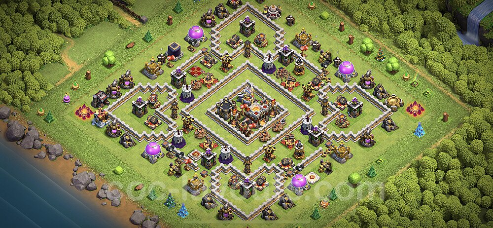 This Town Hall 11 war base is specifically designed to defend against 2-star and 3-star attacks in Clan Wars and Clan War Leagues. The strategic placement of defenses creates multiple compartments that force attackers to use more troops and spells than anticipated. Key defensive structures like Eagle Artillery, Inferno Towers, and X-Bows are positioned to cover crucial sections of the base, making it extremely difficult for opponents to secure a perfect attack. The core of this war base features a centralized Town Hall and Clan Castle, protected by multiple layers of walls and high-damage defenses. This layout forces attackers to commit significant resources just to reach the center, often leaving them without enough firepower to secure the Town Hall destruction. The anti-2-star design ensures that even if attackers breach the outer defenses, they'll struggle to achieve a 50% destruction rating. Air defenses are strategically spread to counter popular air attack strategies like LaLoon (Lava Hound + Balloons) and Electrone (Electro Dragons + Stone Slammer). The symmetrical trap placement and strategic Hidden Tesla positions create deadly surprise elements that can completely derail an attacker's plan. This base has been tested against various meta attack strategies and has consistently proven effective in preventing 3-star attacks.