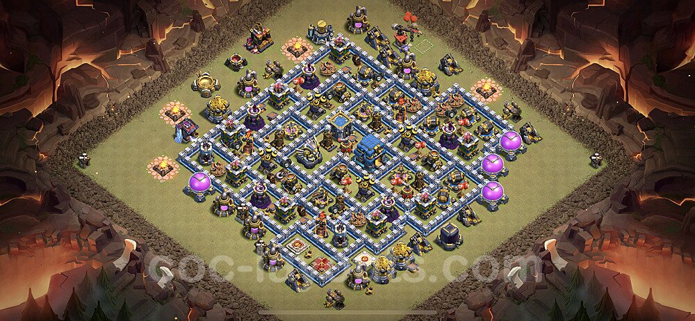 This Town Hall 12 war base is specifically designed to defend against 2-star and 3-star attacks in Clan Wars and Clan War Leagues. The strategic placement of defenses creates multiple compartments that force attackers to use more troops and spells than anticipated. Key defensive structures like Eagle Artillery, Inferno Towers, and X-Bows are positioned to cover crucial sections of the base, making it extremely difficult for opponents to secure a perfect attack. The core of this war base features a centralized Town Hall and Clan Castle, protected by multiple layers of walls and high-damage defenses. This layout forces attackers to commit significant resources just to reach the center, often leaving them without enough firepower to secure the Town Hall destruction. The anti-2-star design ensures that even if attackers breach the outer defenses, they'll struggle to achieve a 50% destruction rating. Air defenses are strategically spread to counter popular air attack strategies like LaLoon (Lava Hound + Balloons) and Electrone (Electro Dragons + Stone Slammer). The symmetrical trap placement and strategic Hidden Tesla positions create deadly surprise elements that can completely derail an attacker's plan. This base has been tested against various meta attack strategies and has consistently proven effective in preventing 3-star attacks.