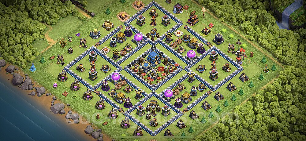 This Town Hall 12 hybrid base offers the best of both worlds - strong resource protection combined with effective trophy defense. The versatile design makes it an excellent choice for players who want to protect their loot while maintaining their trophy count. This balanced approach ensures you don't sacrifice one aspect of defense for another, making it ideal for active players across all league levels. The hybrid layout features centralized resource storages alongside a well-protected Town Hall, with multiple defensive layers that deter both farming raids and trophy pushers. High-value targets are strategically positioned within overlapping defense ranges, forcing attackers to make difficult choices about which objectives to prioritize. The compartmentalized design prevents attackers from easily achieving both loot destruction and the Town Hall kill in a single attack. Defense placement in this hybrid base creates strong coverage against both ground and air attacks. Inferno Towers, X-Bows, and Eagle Artillery work in concert to eliminate threats quickly, while splash damage defenses like Wizard Towers and Bomb Towers counter swarm strategies. The base's funnel-resistant design and strategic trap placement make it effective against popular attack strategies including QC LaLoon (Queen Charge Lava Hound Balloon), Blizzard attacks, and Yeti Smash compositions.