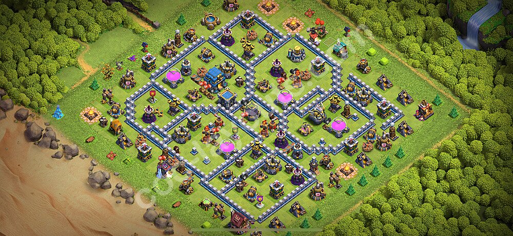 This Town Hall 12 war base is specifically designed to defend against 2-star and 3-star attacks in Clan Wars and Clan War Leagues. The strategic placement of defenses creates multiple compartments that force attackers to use more troops and spells than anticipated. Key defensive structures like Eagle Artillery, Inferno Towers, and X-Bows are positioned to cover crucial sections of the base, making it extremely difficult for opponents to secure a perfect attack. The core of this war base features a centralized Town Hall and Clan Castle, protected by multiple layers of walls and high-damage defenses. This layout forces attackers to commit significant resources just to reach the center, often leaving them without enough firepower to secure the Town Hall destruction. The anti-2-star design ensures that even if attackers breach the outer defenses, they'll struggle to achieve a 50% destruction rating. Air defenses are strategically spread to counter popular air attack strategies like LaLoon (Lava Hound + Balloons) and Electrone (Electro Dragons + Stone Slammer). The symmetrical trap placement and strategic Hidden Tesla positions create deadly surprise elements that can completely derail an attacker's plan. This base has been tested against various meta attack strategies and has consistently proven effective in preventing 3-star attacks.